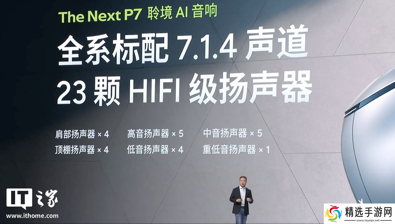 新车还配备 23 颗定制 HIFI 级扬声器(含 4 个肩部扬声器、5 个高音扬声器、5 个中音扬声器、4 个顶棚扬声器、4 个低音扬声器、1 个重低音扬声器),支持 7.1.4 声道 AI 全景声;高配车型拥有四门静音电吸门、双层夹胶玻璃、9 英寸流媒体后视镜。