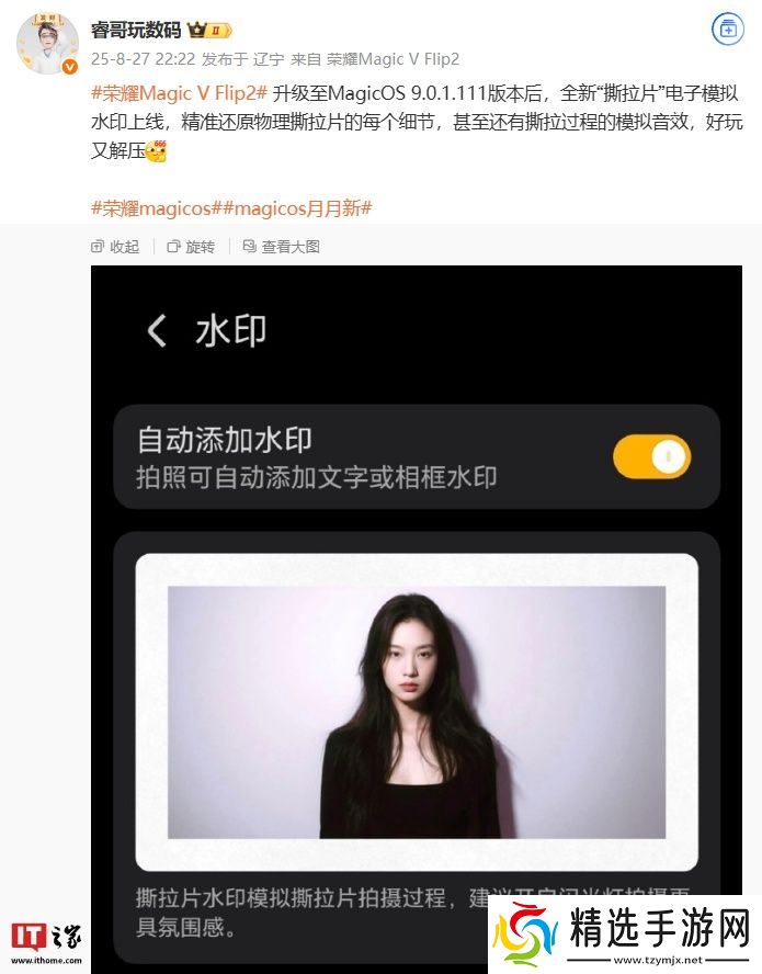 本站 8 月 27 日消息,据博主 @睿哥玩数码 今日分享,荣耀 Magic V Flip2 小折叠手机在升级至 MagicOS 9.0.1.111 版本后,新增“撕拉片”电子模拟水印。据称,该水印可还原物理撕拉片的细节,并拥有撕拉过程的模拟音效。