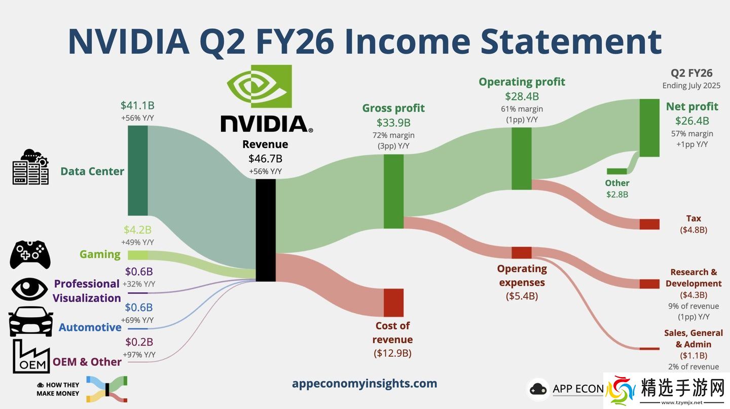 本站 8 月 28 日消息,英伟达(Nvidia)今天(8 月 28 日)公布 2026 财年第 2 财季(截至 2025 年 7 月 27 日)财报,营收达 467 亿美元(本站注:现汇率约合 3342.45 亿元人民币),同比增长 56%,环比增长 6%,数据中心业务贡献 411 亿美元,占比超过八成。