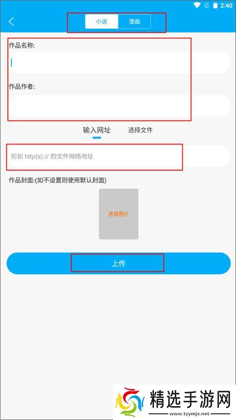 2、这里包含小说和漫画两个页面,在小说界面中输入作品名称、作品作者、文件网络地址、最后点击上传即可。