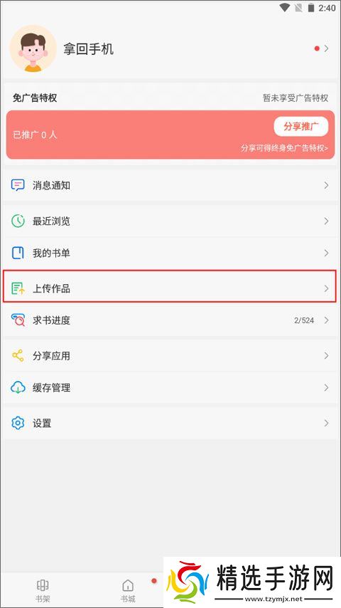 1、打开笔趣阁App,默认进入【书城】界面,点击下方菜单栏【我的】,点击上方的“上传作品”。