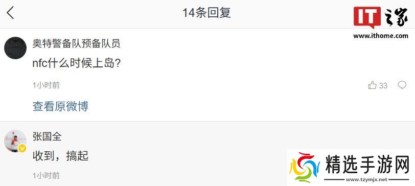 本站注意到,有用户向小米手机系统软件部总监张国全反馈,希望实现 NFC 刷卡上岛。对此张国全回复称“收到,搞起。”