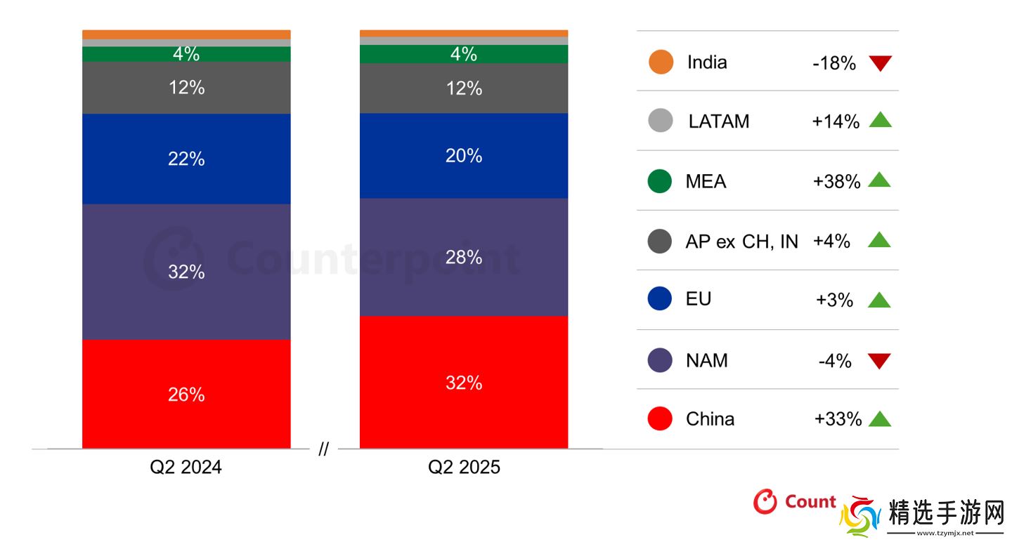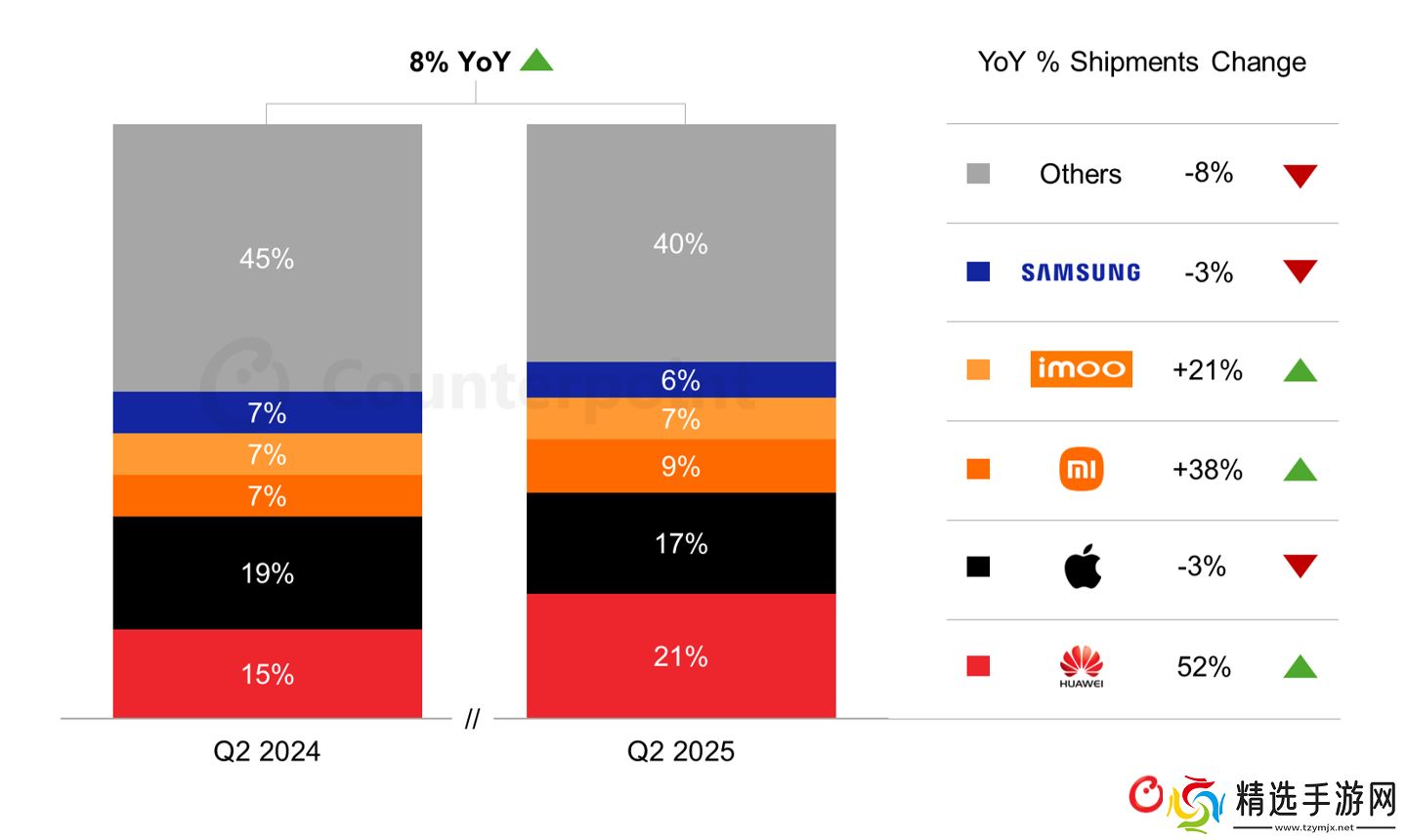 全球市场的另一家主要参与者三星的出货量同比下降 3%。