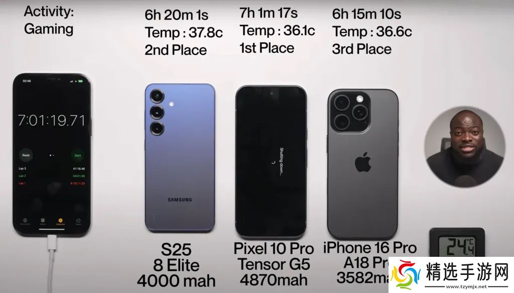 最终成绩显示,iPhone 16 Pro(3582mAh 电池,A18 Pro 芯片,3nm 工艺)坚持了 6 小时 15 分钟;Galaxy S25 成绩为 6 小时 20 分钟;Pixel 10 Pro 则在 Asphalt 游戏加载阶段才彻底耗尽电量。