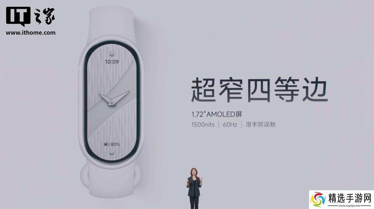 据介绍,小米手环 10 采用超窄四等边设计,配备 1.72 英寸 AMOLED 屏幕,支持 1500nits 亮度、60Hz 刷新率、湿手防误触等功能。
