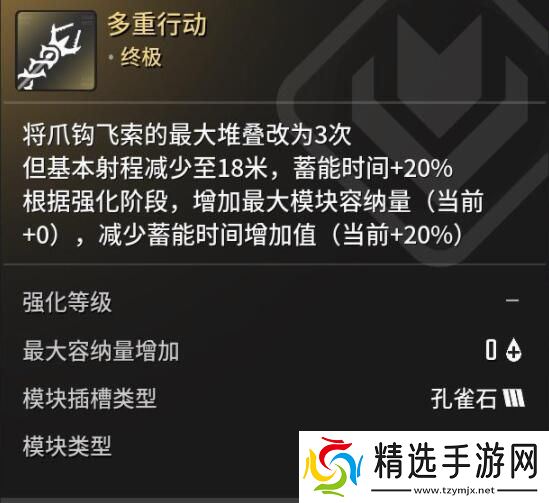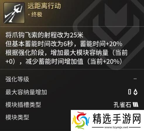 将爪钩飞索的最大堆叠改为3次但基本射程减少至18米,蓄能时间+ 20%根据强化阶段,增加最大模块容纳量(当前+0) ,减少蓄能时间增加值(当前+20%)