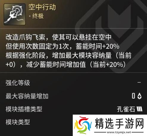 改造爪钩飞索,使其可以悬挂在空中但使用次数固定为1次,蓄能时间+ 20%,根据强化阶段,增加最大模块容纳量(当前+0),减少蓄能时间增加值(当前+20%)