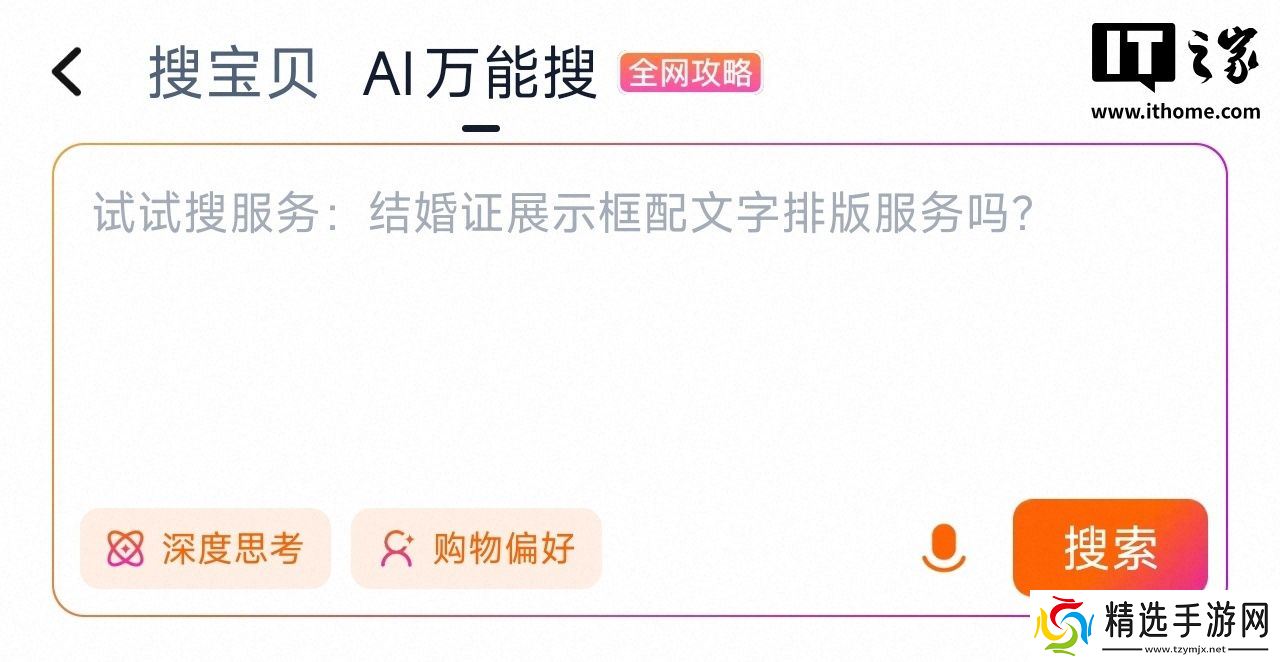 此外,淘宝今年 8 月灰度测试了“AI 万能搜”新功能,入口位于淘宝 App 搜索功能页面,显示为“AI 万能搜”Tab。