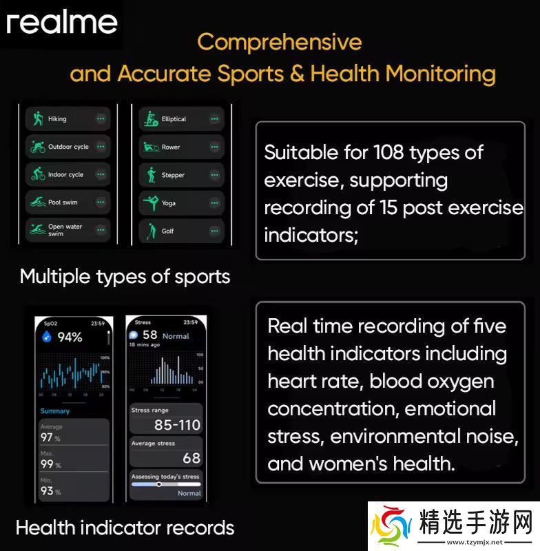 健康功能方面,该手表支持 108 种运动类型记录,可监测 15 项运动后指标,并实时追踪心率、血氧浓度、情绪压力、环境噪音及女性健康等 5 类健康数据。