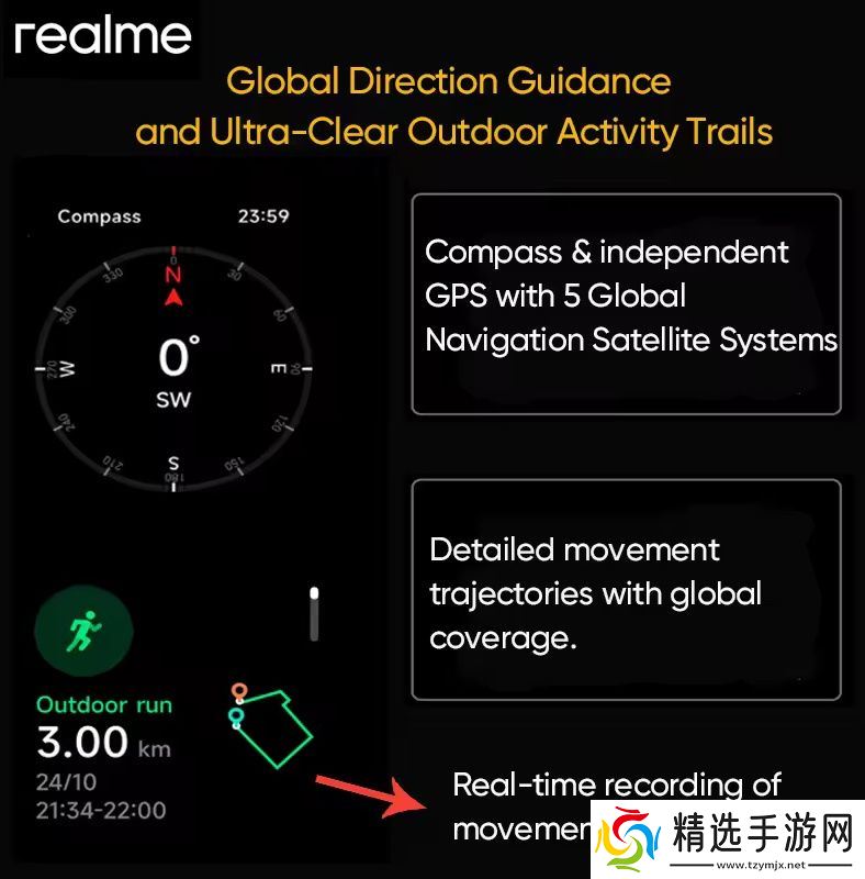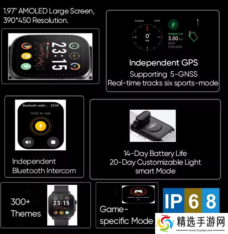 该智能手表具备 IP68 防水等级,支持 5-GNSS 卫星定位、实时运动追踪和 6 种运动模式,同时可独立进行蓝牙通话,无需手机辅助即可拨打 720 分钟蓝牙电话。