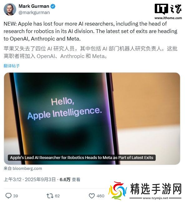 本站 9 月 3 日消息,彭博社马克・古尔曼今日报道称,苹果在人工智能领域的人才流失仍在继续。