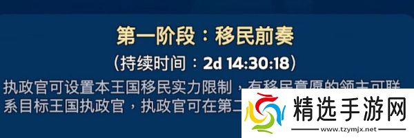 每次活动可移民的王国为发展历程相同的邻近王国。无法迁入角色创建天数超过王国开后天数45天以上的王国。