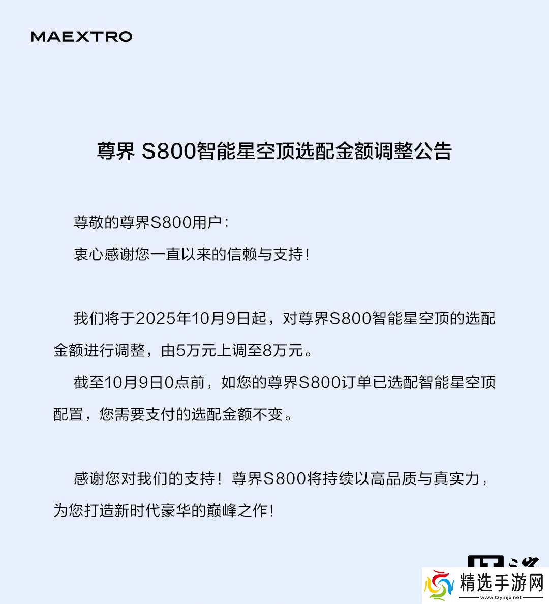 我们将于 2025 年 10 月 9 日起,对尊界 S800 智能星空顶的选配金额进行调整,由 5 万元上调至 8 万元。