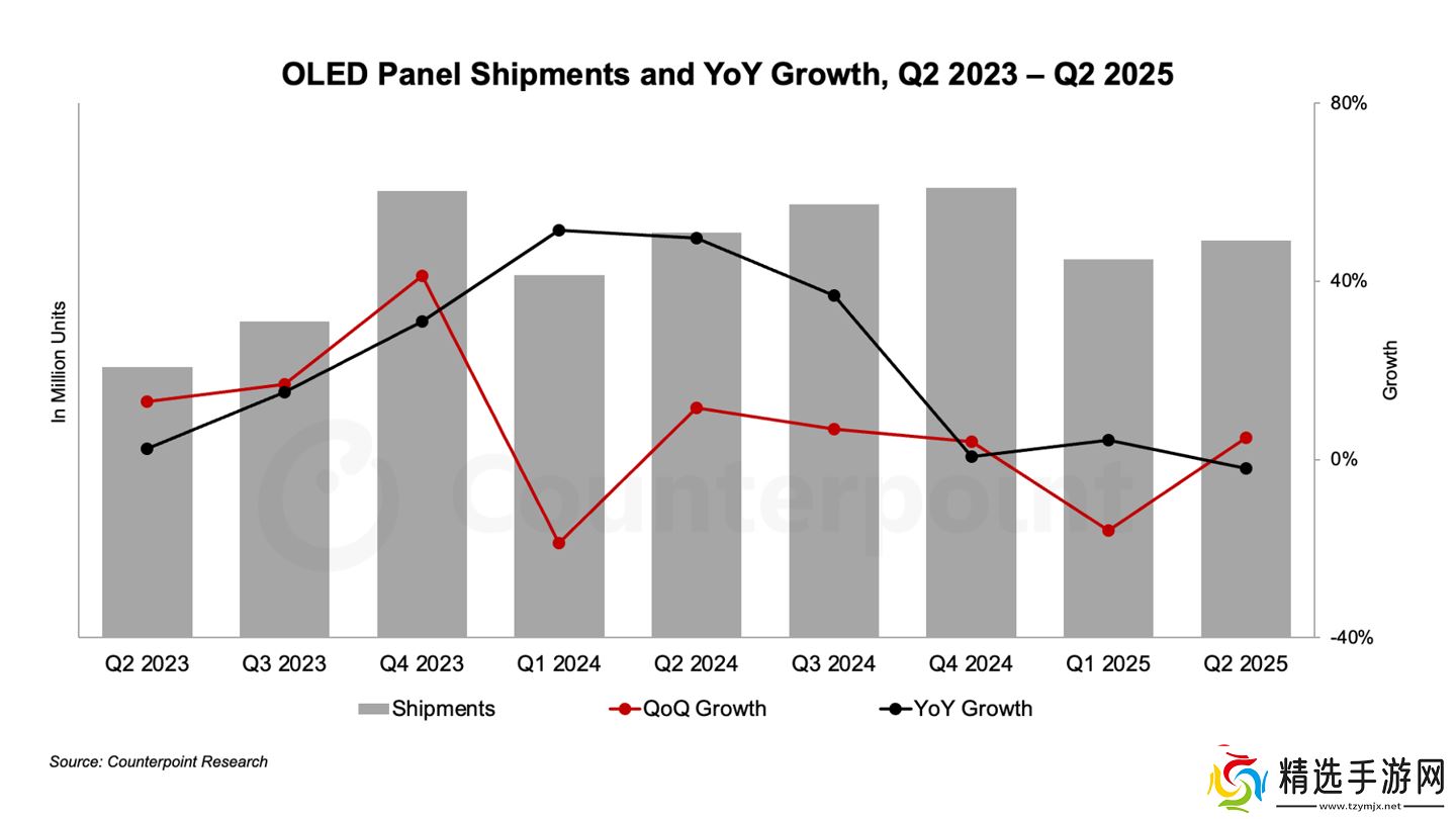 本站 9 月 5 日消息,市场研究机构 Counterpoint Research 今天(9 月 5 日)发布博文,报告称 2025 年第 2 季度全球 OLED 面板出货量同比下降 2%、环比增长 5%,作为对比,今年第 1 季度出货量同比增长 4%、环比下降 16%。