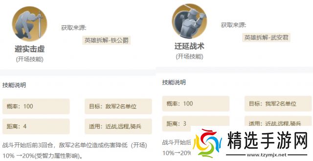 这两个技能能够大大提升我军前几回合的坦度,【迁延战术】可以让我军2名英雄受到的伤害降低,【避实击虚】则是让敌军2名英雄打出的伤害降低。这两个搭配一起会让我们的队伍非常的肉,让敌军就算有着爆炸般的输出打过来也和棉花一样。