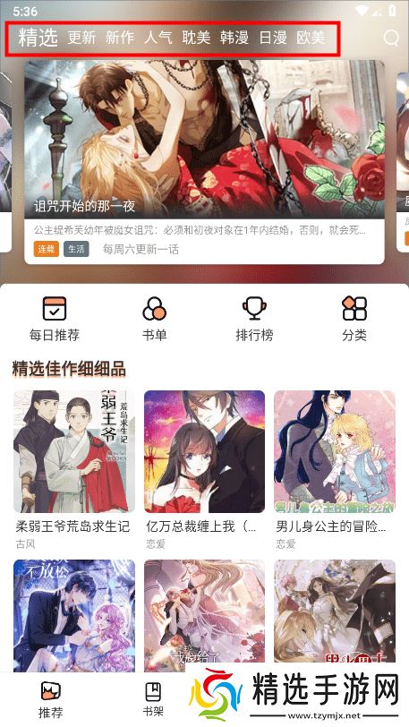 2、在app首页,我们可以看到精选、更新、新作、人气、耽美、韩漫、日漫、欧美等多个板块;