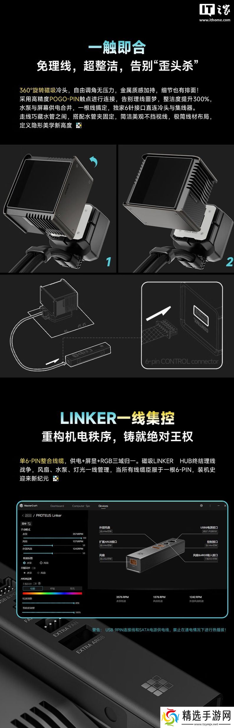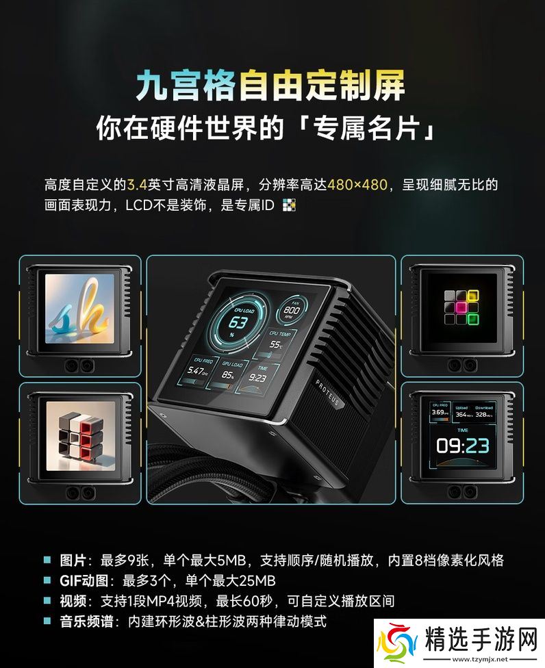 据介绍,这款水冷的冷头配备一块 3.4 英寸 480x480 分辨率 TFT LCD 面板(支持自定义图片 / 视频),数显屏模块采用磁吸设计,通过 POGO-PIN 触点与冷头连接。同时水冷的供电、屏显、RGB 采用单 6-PIN 整合线缆设计。