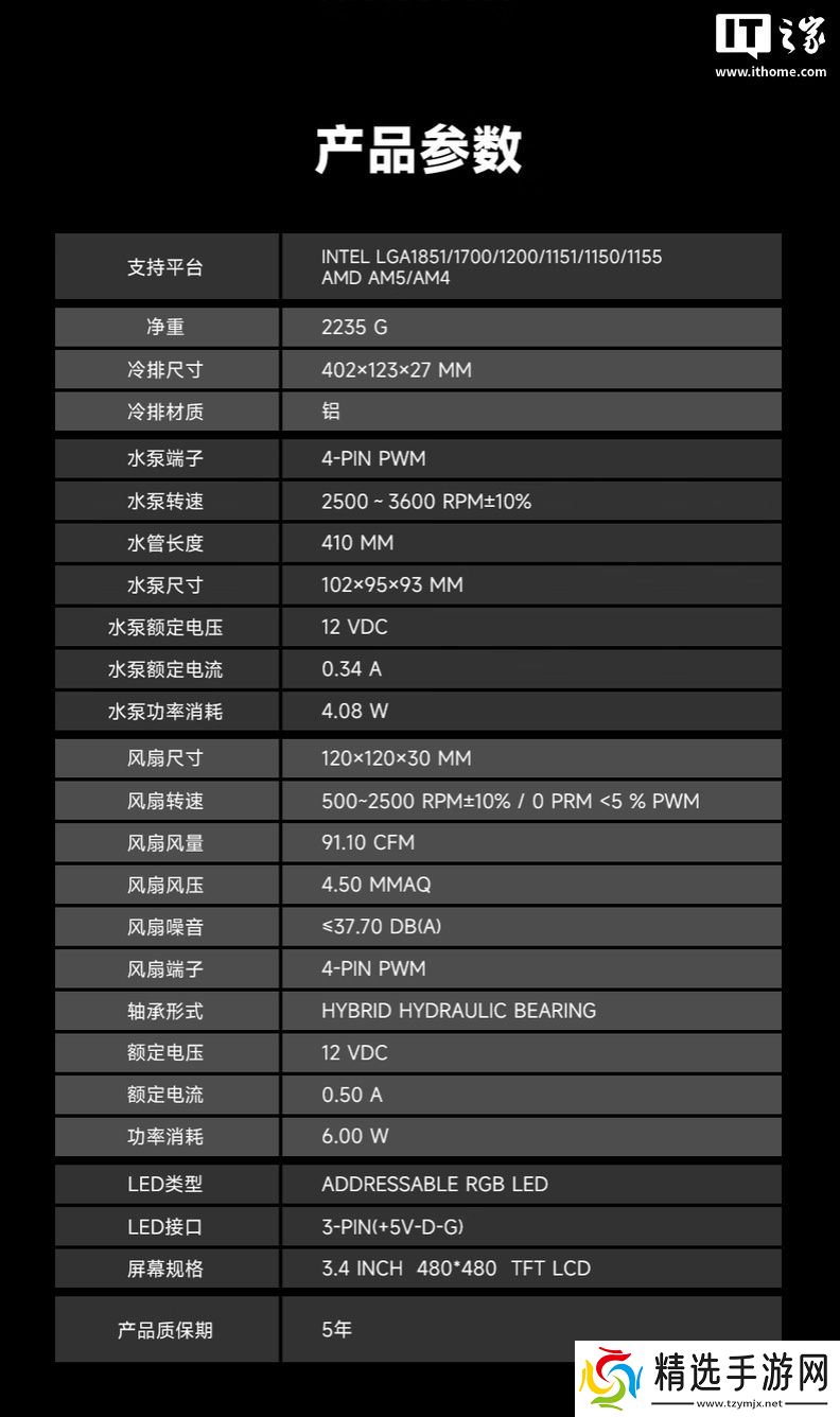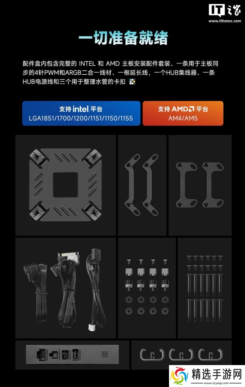 该水冷冷排尺寸为 402x145x27mm,水泵和尺寸则为 102x95x93mm,水冷管长 410mm,水冷的标配扣具为全金属材质,支持免工具手拧拆装,兼容 Intel LGA1851/1700/1200/115X 平台和 AMD AM4 / AM5 平台。