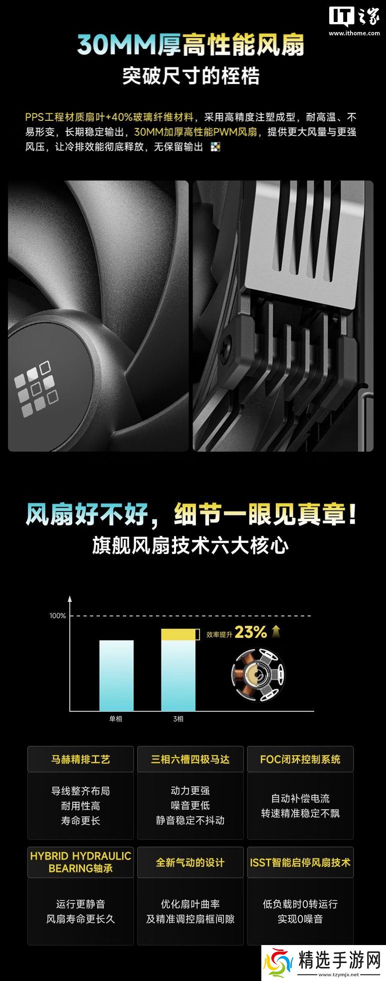 该水冷标配三把 120x120x30mm 尺寸液压轴承黑化风扇,扇叶材质使用 PPS+40% 玻璃纤维复合材料,风扇转速范围设定在 500~2500RPM±10%,可提供 91.10CFM 的风量和 4.50mmH2O 的静压,满载噪音值为 37.7dB(A)。