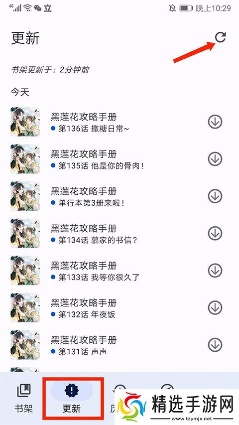 9、在更新界面,选择右上角【更新】图标可将书架中的漫画进行更新,