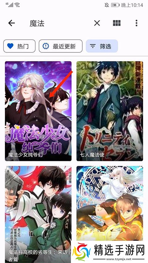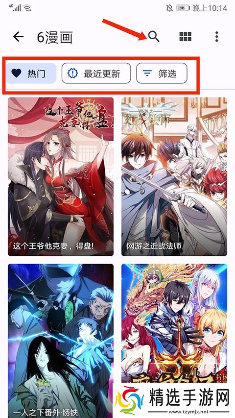 5、如图,可看到各种各样的热门漫画,包括热门、最近更新、筛选等分类,我们也可以选择上方【放大镜】图标进行搜索喜欢的漫画,