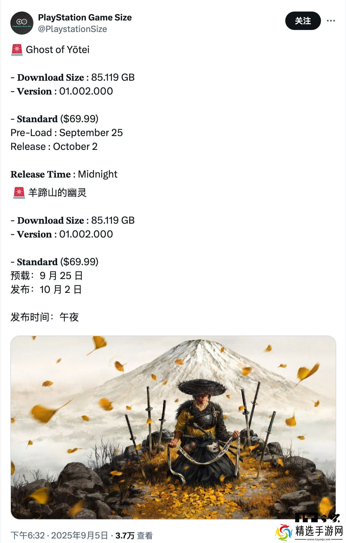 本站 9 月 5 日消息,X 博主 PlayStation Game Size 今晚揭晓了《羊蹄山之魂》的下载大小及预载日期。最新消息显示,《羊蹄山之魂》下载文件大小为 85.119GB(版本 01.002.000),玩家可以在 9 月 25 日提前预载,解锁时间为 10 月 2 日。