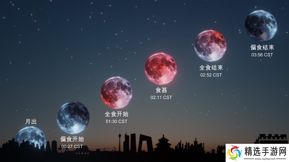 本站注:在月全食发生时,月球会因阳光经地球大气折射而呈现出古铜色至暗红色光辉 —— 这种现象常被称为“血月”。当月亮走到地球本影最深处时,变得最红最暗,这就是最精彩的“食甚”阶段。