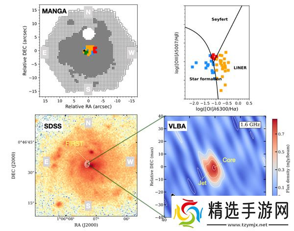 从更广阔的统计视角来看,这一发现尤为突出。在 3000 多个 MaNGA 矮星系中,研究人员筛选出 628 个 AGN 候选体,其中约 62% 的源存在 AGN 偏离星系光学中心的现象,表明离核现象或许并不罕见。但“候选”并不等同于“确认”,论文合作者,西班牙空间科学研究所 (ICE-CSIC) 研究员 Mar Mezcua 强调:“尤其是在矮星系中,要获得明确的游离 AGN 观测证据极为困难,因此此类发现极为稀有。”安涛团队对 600 多个候选体进行了多级筛选,最终选出 11 个最有希望探测到射电辐射的目标,并利用最高灵敏度和分辨率进行跟踪观测。在这 11 个目标源的观测中,只有 MaNGA 12772-12704 同时具备“致密高亮温度、秒差距喷流、30 年时域光变”三重证据,成为目前唯一获得确证的案例。