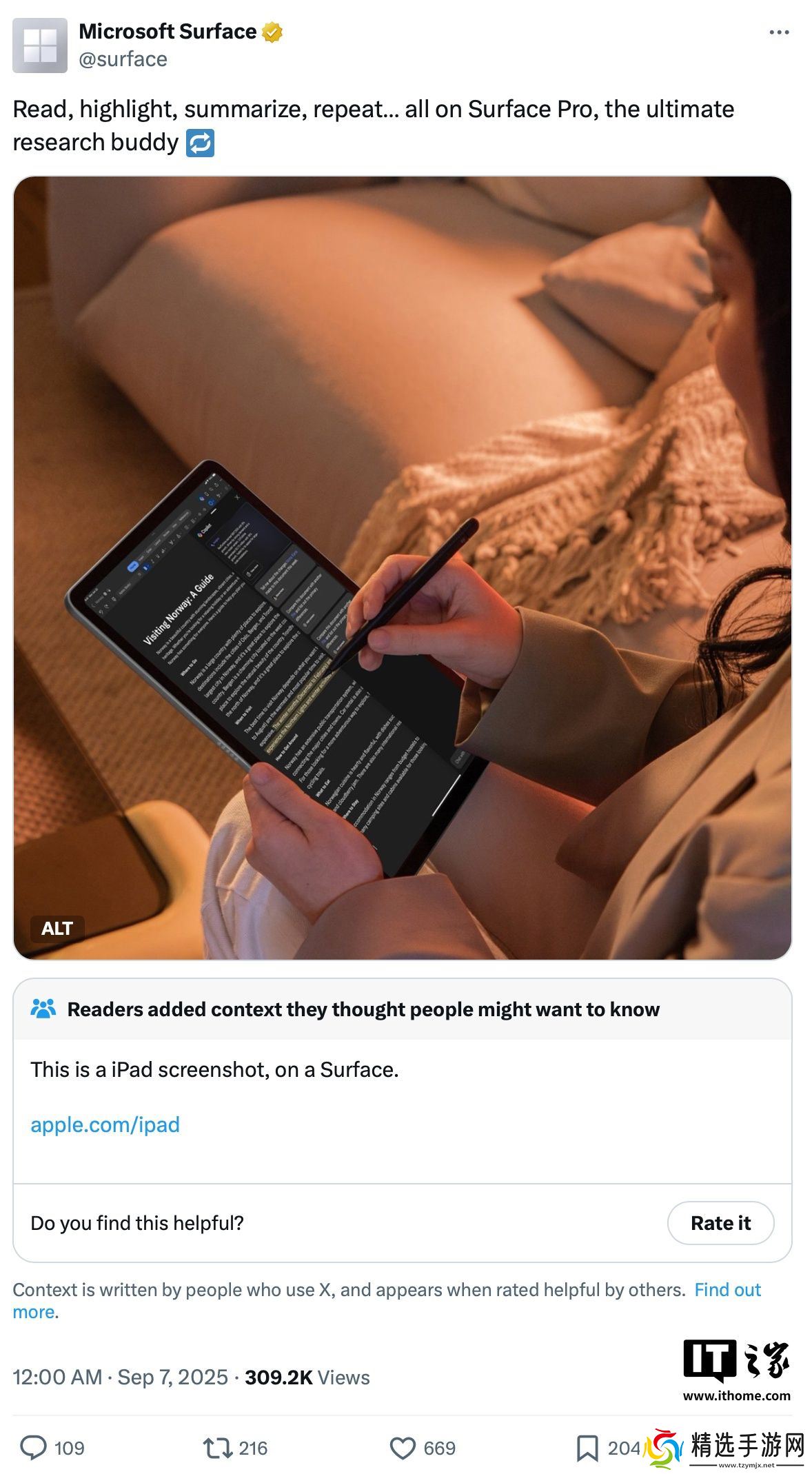 据悉,相应账号在昨天中午发布一条贴文,看似是宣传 Surface Pro 阅读文档的便捷性,但相应海报中的 Surface Pro 实际上却配了 iPadOS 的截图内容,目前相应贴文已被不少用户加上了社区笔记,截至本站发稿,相应贴文中的错误内容仍未修正。
