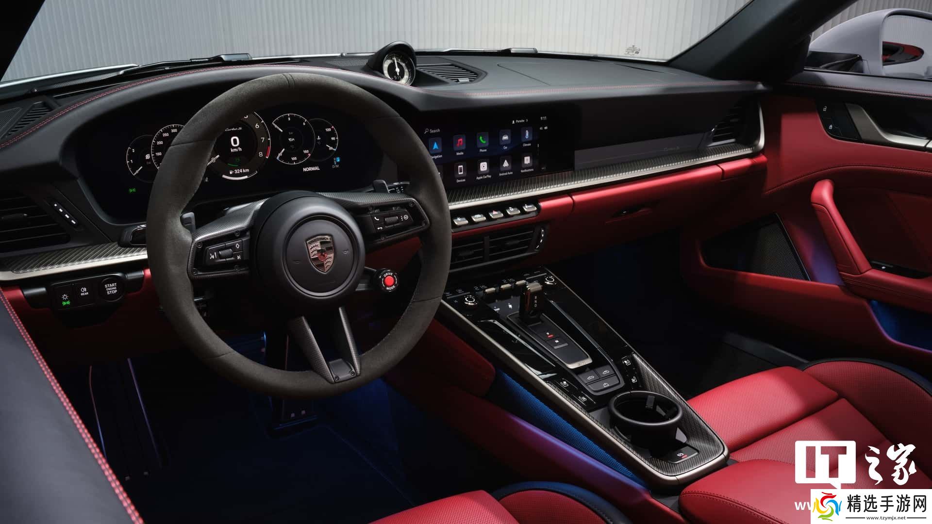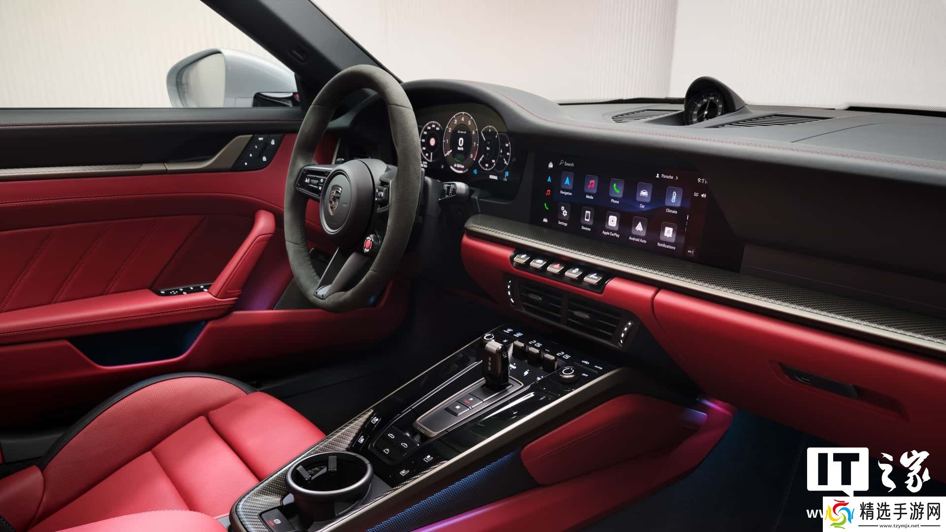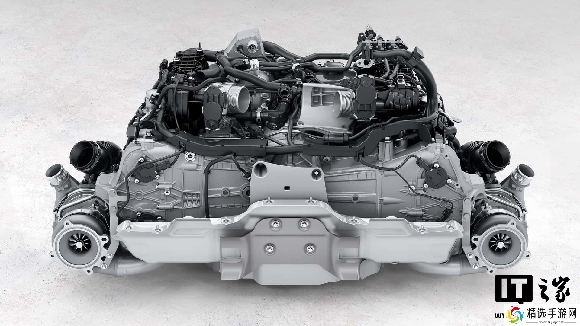 这款代号 992.2 的全新 Turbo S 搭载与 Carrera GTS 同源的“T-Hybrid”基础混动系统,后备厢内配备一块 1.9 千瓦时、400 伏的锂离子电池(非混动版 911 的 12 伏电池也置于此处),发动机与 8 速双离合 PDK 变速箱之间还嵌入了一台电动机。不过与 Carrera GTS 采用的 3.6 升水平对置六缸单电动涡轮不同,新 Turbo S 升级为双电动涡轮增压器。