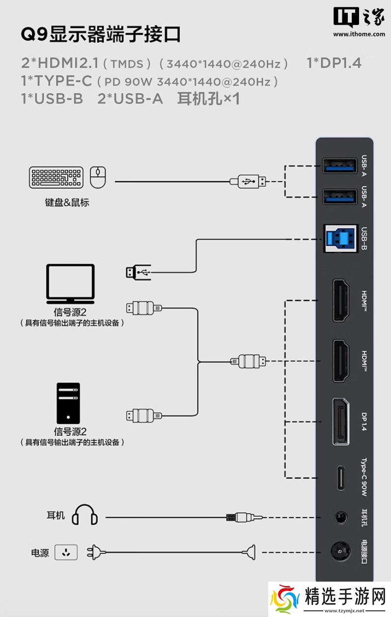 该机提供 Dancing Light 灯效系统,具备双 3W 扬声器,支持 VESA 壁挂,显示器支架支持俯仰 / 倾斜 / 旋转。提供 90W USB-C、2 个 USB-A(KVM)及对应的 USB-B 接口、2 个 HDMI 2.1 接口、1 个 DP 1.4 接口、1 个 3.5mm 音频接口。