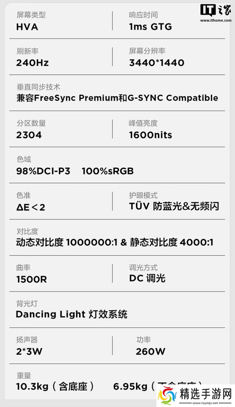 该机配备一块 3440 x 1440 分辨率 QD-Mini LED 背光 HVA 面板(2304 分区),峰值亮度 1600 尼特,曲率 1500R,静态对比度 4000:1,动态对比度 100 万:1,覆盖 98% DCI-P3、100% sRGB 色域。