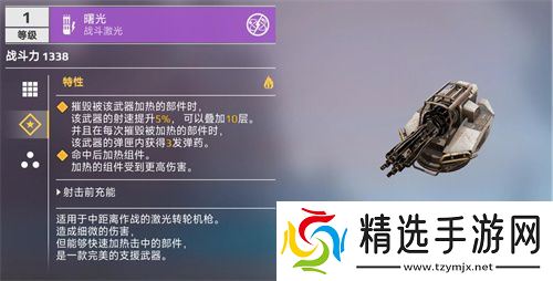 入门级的激光转轮机枪“曙光”偏向于发挥支援功能。“曙光”本身在伤害效率上并不突出,其主要作用是通过加热击中的部件,使目标承受的伤害提升。
