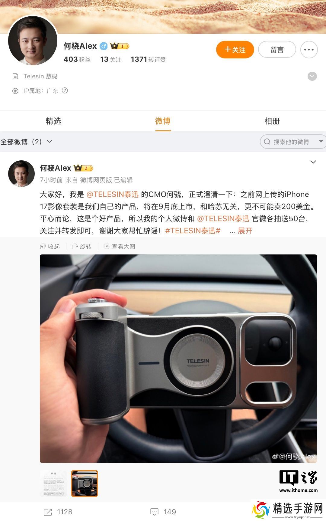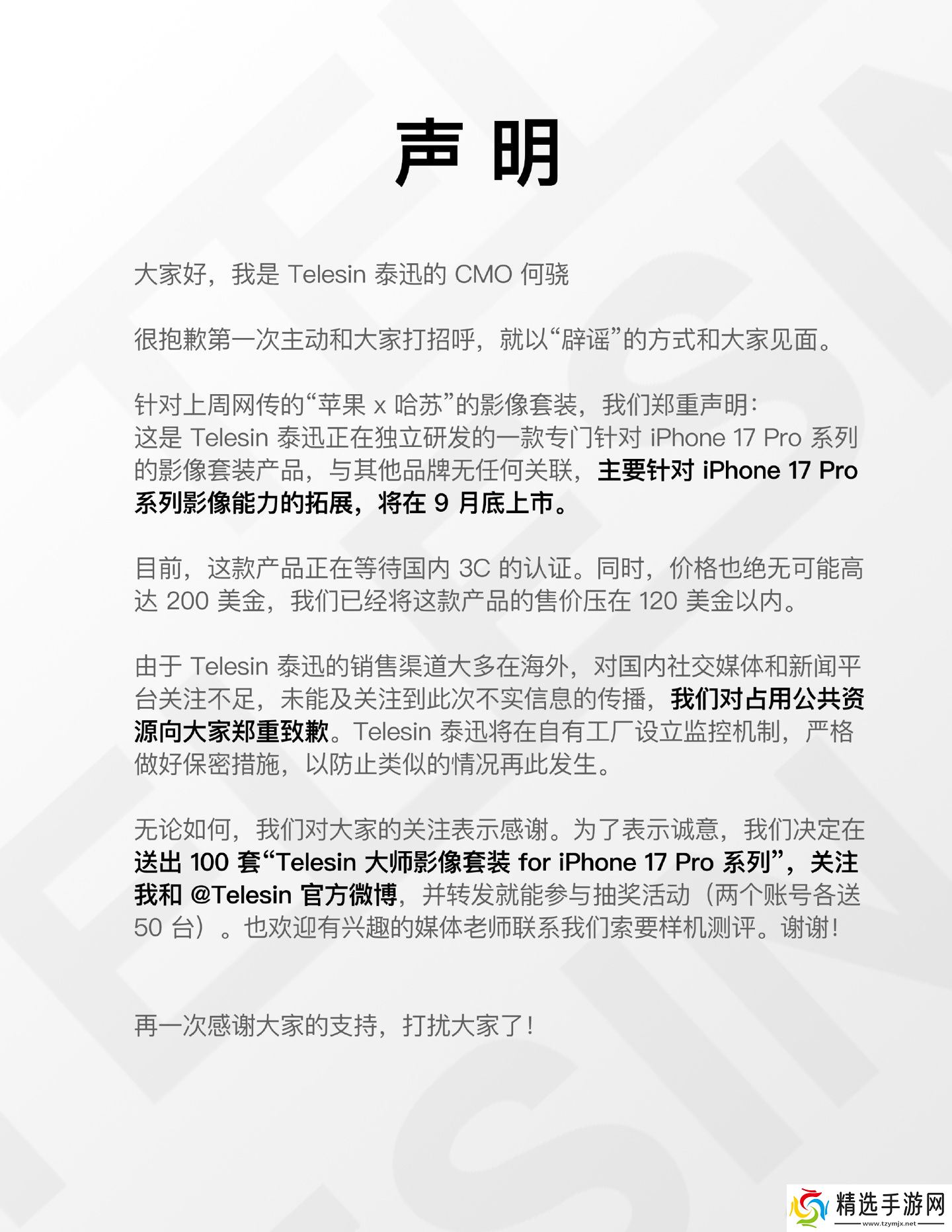 不过,今日深圳市泰迅数码有限公司 CMO 何骁发布声明称,网传的“拍照手柄外设”实为该公司的产品,和哈苏无关,将在本月底上市,主要面向海外销售,定价为 120 美元(现汇率约合 855.4 元人民币)左右,目前正在等待国内 3C 认证。
