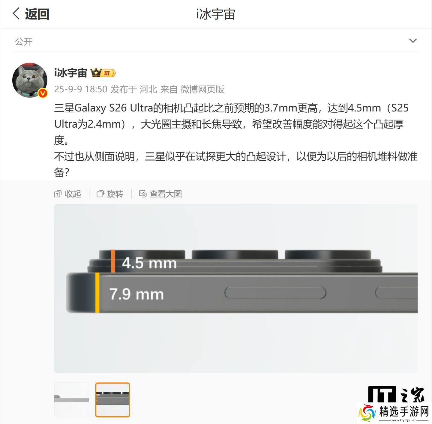 三星 Galaxy S26 Ultra 的相机凸起比之前预期的 3.7mm 更高,达到 4.5mm(S25 Ultra 为 2.4mm),大光圈主摄和长焦导致,希望改善幅度能对得起这个凸起厚度。