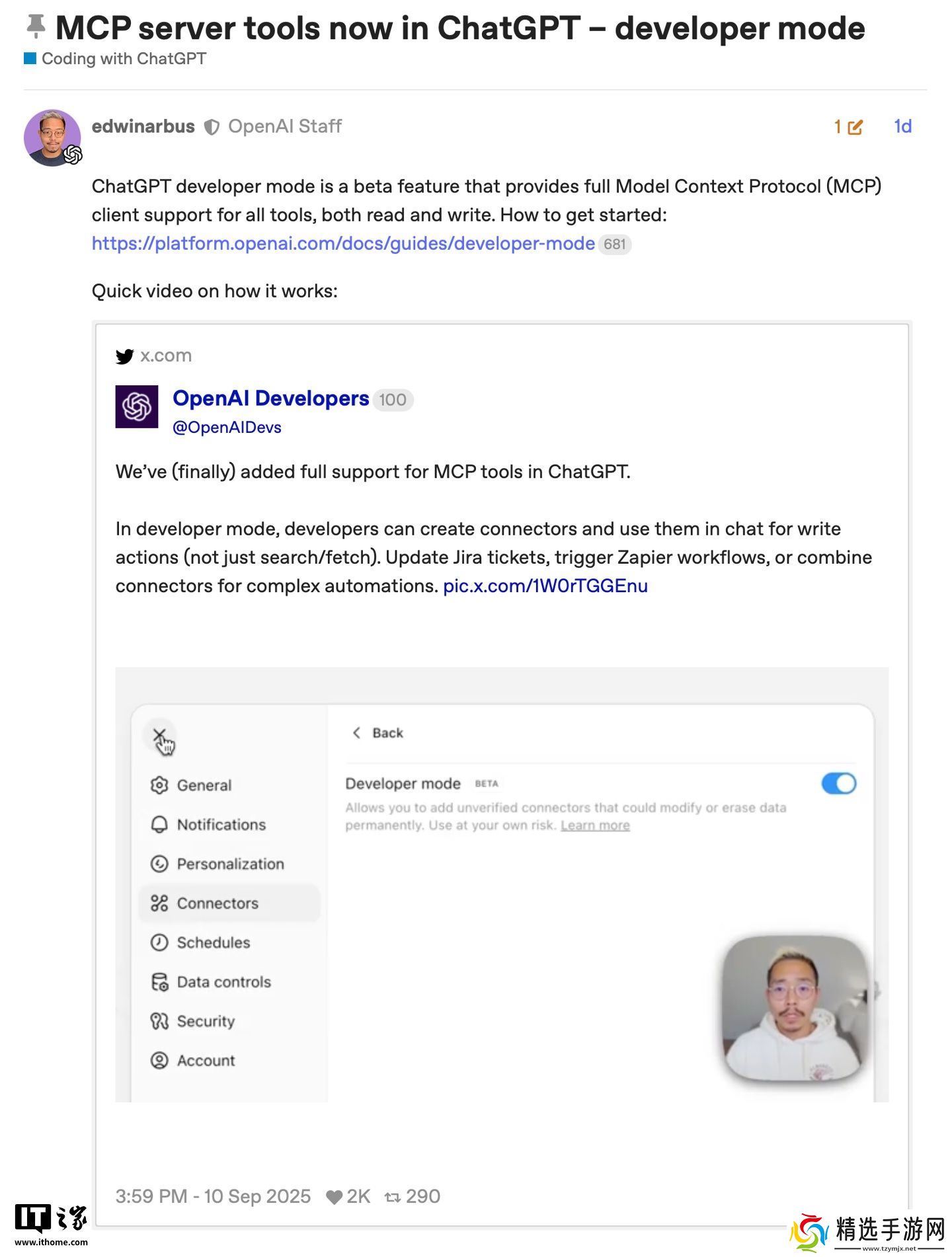 本站 9 月 11 日消息,OpenAI 发文,宣布开始为 ChatGPT 带来“开发者模式(Developer Mode)”,用户可以在该模式下接入 MCP (Model Context Protocol)客户端。不过相应功能目前暂时仅上线网页端,同时仅支持 Plus / Pro 订阅用户使用。