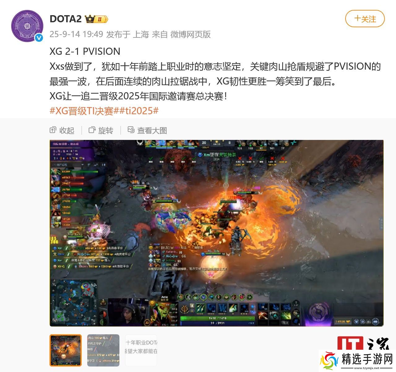 本站 9 月 14 日消息,在刚刚结束的《DOTA2》2025 年国际邀请赛 (TI14) 败者组决赛中,中国战队 Xtreme Gaming (XG) 在先负一局的情况下成功连追两盘,最终以 2:1 的比分战胜 PARIVISION 晋级到本次 TI 的决赛中。XG 将在稍后(预计 21:00 开始)与 Team Falcons 争夺最终的冠军。