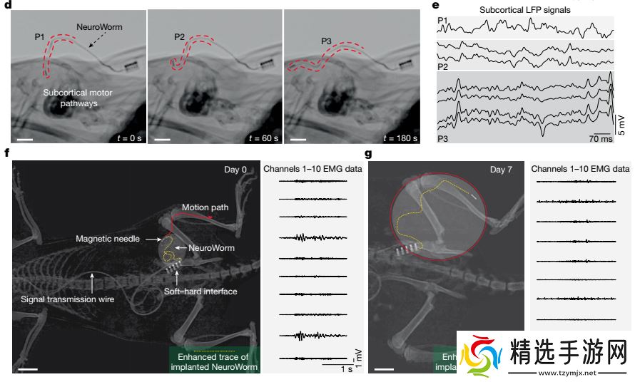 它的应用还远不止于大脑。研究团队还首次实现了电极在肌肉内的长期植入与稳定工作。团队利用微创植入技术,成功实现了 NeuroWorm 电极在大鼠腿部肌肉内稳定工作超过 43 周。在外部磁场的操控下,NeuroWorm 可在肌肉上表面实现游走,可在植入后的一周内每天变换位置进行监测。