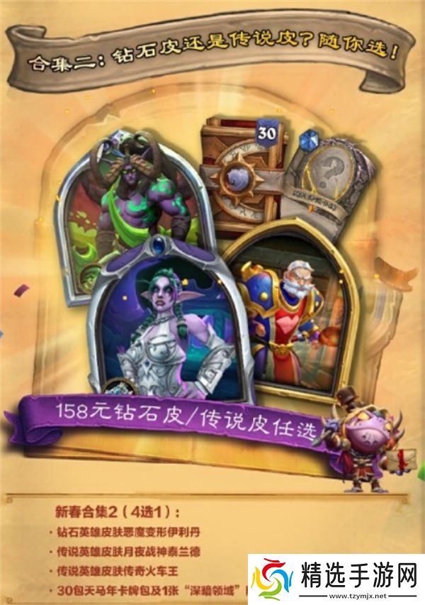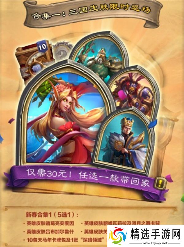 消费30元:可领取英雄皮肤/卡背(洛瑟玛赛隆)或2包深暗领域卡包。