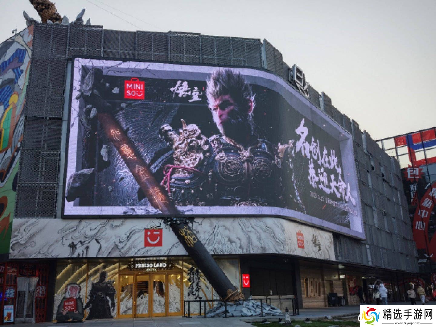 近日,北京名创优品1号店外,一幅巨幕广告吸引了众多游戏爱好者的目光。这幅广告来自备受瞩目的游戏《黑神话:悟空》,其主角天命人身披战甲,手持如意金箍棒,仿佛跨越次元壁,与现实世界相连。