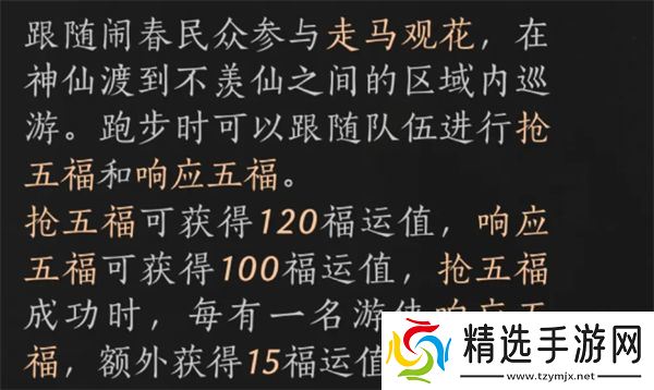 响应五福:响应其他玩家的五福口号,可获得100福运值,每有一名游侠响应五福口号,额外获得15福运值。