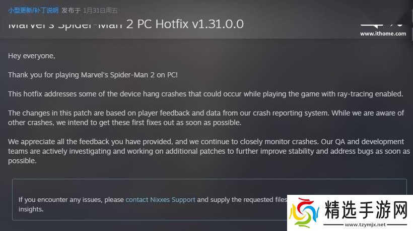 面对玩家的不满与反馈,游戏官方迅速响应,于今日凌晨紧急推送了 v1.31.0.0 热更新补丁。此次更新主要修复了在启用光线追踪技术时可能导致的游戏崩溃问题,有效提升了游戏的稳定性。同时,官方也表示已注意到其他多种原因引发的崩溃情况,并承诺将积极展开调查,尽快发布新的修复补丁,以全面优化玩家体验。