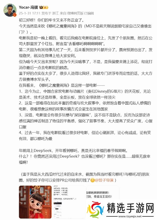 在近期的一次社交媒体互动中,《黑神话:悟空》这款备受瞩目的游戏制作人冯骥,对近期上映的动画电影《哪吒之魔童闹海》给予了高度评价。他称赞该影片不仅在国内合家欢电影及动画领域树立了新的标杆,其美术设计的精致、技术应用的先进以及故事情节的引人入胜,在全球范围内也堪称佼佼者。