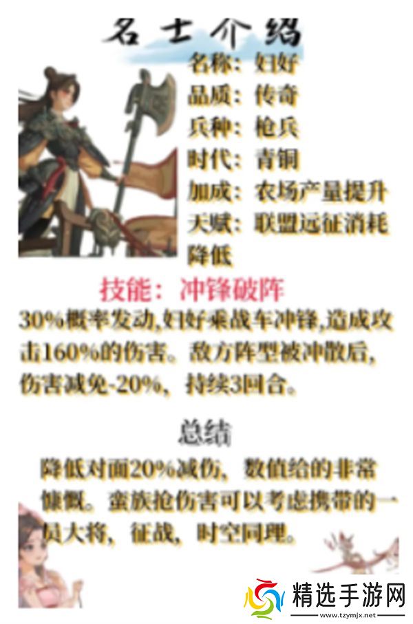 妇好适合用于提升农场的资源产量,且其技能“冲锋破阵”可以有效削弱敌人的防御,提供良好的战斗优势。她的天赋使她在远征中表现出色,因此如果你在资源管理和远征方面有较大需求,妇好将是非常适合培养的名士。