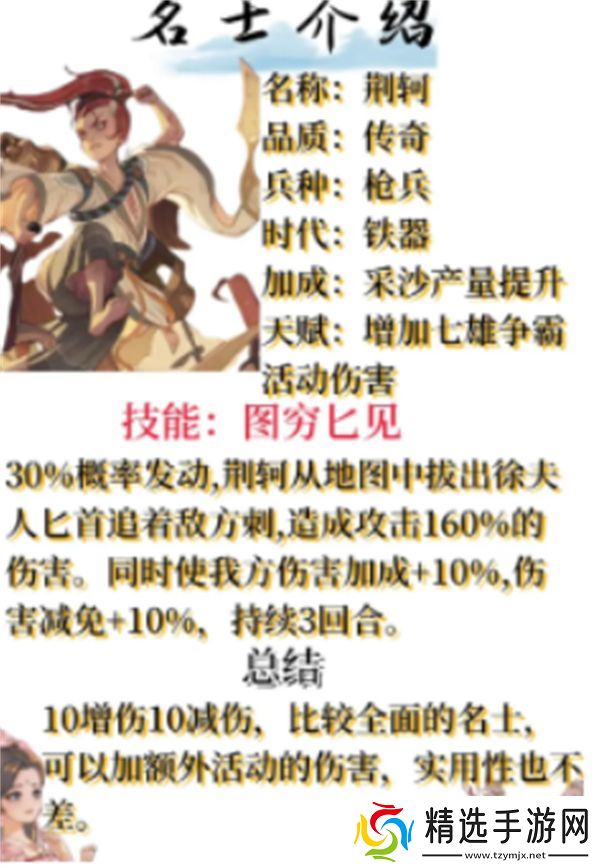 荆轲是一个优秀的攻击型名士,尤其擅长在战斗中造成伤害,并且能为团队提供伤害加成和减免。其天赋加成七雄争霸,适合用于竞技场和PVP场合。如果你需要一个高伤害输出并能辅助队友的名士,荆轲是一个不错的选择。