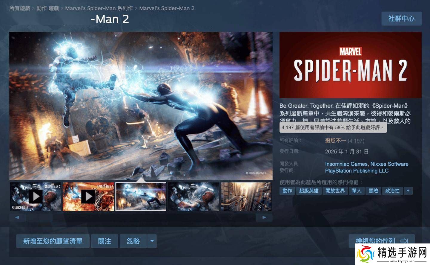 目前,《漫威蜘蛛侠 2》在Steam平台上的好评率仅为58%,评价呈现“褒贬不一”的状态。相比之下,前作《蜘蛛侠:迈尔斯・墨拉莱斯》的好评率高达93%,而《漫威蜘蛛侠 1》的重制版也获得了96%的高分。这一对比之下,不难发现,《漫威蜘蛛侠 2》已成为索尼第一方在Steam平台上评价最低的游戏。