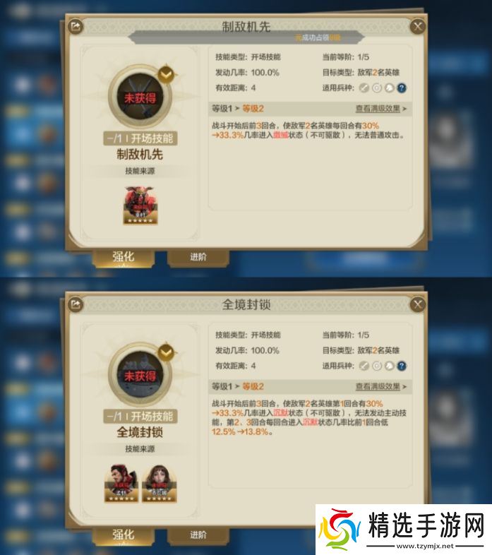 专属技能【万众一心】:每回合随机1~2名友军尝试发动伤害类主动技能失败时,有50%→55.5%几率可以再尝试发动一次,且本回合造成的首次伤害提升。