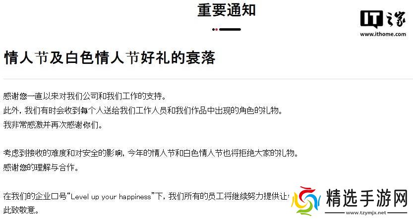 公告中,光荣特库摩首先对长期以来给予支持与厚爱的粉丝们表达了诚挚的感谢,特别是对那些过去曾向公司成员及虚拟角色赠送礼物的粉丝表示了特别的谢意。然而,出于对公司安全及日常管理的考量,公司决定在今年情人节与白**人节期间,不再接收任何形式的礼物。