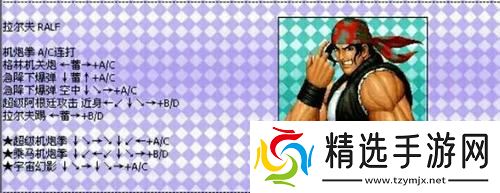 机炮拳:A或C连打格林机关炮:←(蓄)→+A或C急降下爆弹:↓(蓄)↑+A或C急降下爆弹:(跳跃中)↓→+A或C超级阿根廷攻击:(近身)←↓→+B或D拉尔夫踢:←(蓄)→+B或D超级机炮拳:↓→↓←+A或C乘马机炮拳:↓←↓→+B或D宇宙幻影:↓→↓→+A或C经典的拳皇97版本和经典的角色都出来了,选你最喜欢的角色,用拳皇97出招表摇杆,来薄纱你的对手,让他们在你恐怖的实力下颤抖,直接拿出你最喜欢的角色一串三,暴打他!