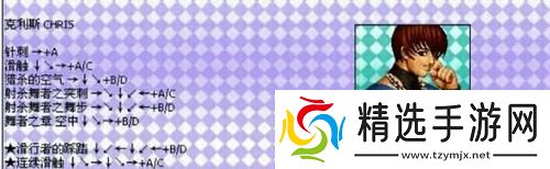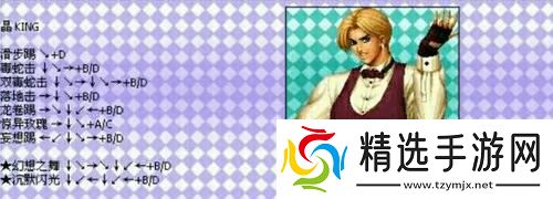 滑步踢:↓→(这两个键同时按)+D毒蛇击:↓→+B或D双毒蛇击:↓→↓→+B或D落地击:→↓→+B或D龙卷踢:→↓←+B或D惊异玫瑰:→↓→+A或C妄想踢:→↓←+A或C幻想之舞:↓→↓←+B或D沉默闪光:↓←↓←+B或D18.金家藩